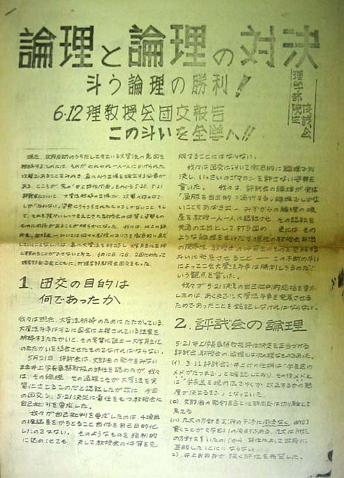 現在,政府反動のうちだしてきている大管法の意図を粉砕するためには,それがわれわれ一人一人にかけられた攻撃であることをみぬき,真に闘う立場を確立する必要がある.ところが,先の「井上辞任問題」をめぐる5.20,5.21評議会において,大管法粉砕の立場が,攻撃の枠の中でしか「闘わない」姿勢にうらうちされたものでしかないこと,そして,それを陰ぺいしつつ支えてきた教授会の体質と姿勢そのものに問題があることが明らかになった.我々は,以上の評議会,教授会,--ひいては個々の教授のあり方を徹底的に追求していくことなしには,真に大管法を粉砕し,大学民主化を押し進めることができないと考え,6月10日,12日,2回にわたって理学部自治会とともに,対理学部教授会団交をもった.
