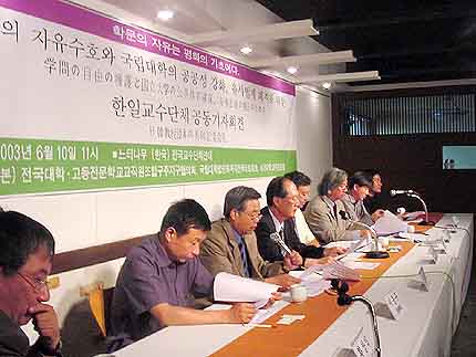 今日、大学の教育と研究において、国際的な協力と連帯はますます不可欠の要素となっている。しかし、その教育と研究のための十分な人的・物的資源の確保、そしてその活動に於ける自由の確保、すなわち「学問の自由」の擁護においても、国際的な協力の必要性が見落とされてはならない。われわれは今日、特にこの面において、日本と韓国の大学人の協力と連帯の必要を強く感じている。それは今、両国に於いて、これらの基盤が大きな脅威にさらされているからであるからでる。それらは「学問の自由」に対する脅威と、公的な財政的支持の後退によって起こる高等教育への平等なアクセス権への脅威である。