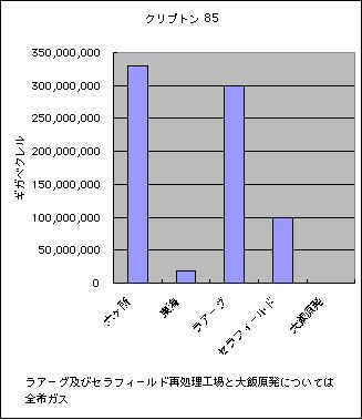 チェルノブイリ事故での希ガスの大部分は短寿命(約5日)のキセノン133のため,クリプトン85だけで比較するのが妥当です.そうすると六ヶ所事業所の年間放出量は実にチェルノブイリの10倍です.実はこれはグリーンピースの元の資料の12ページにすでにグラフになっていました.
