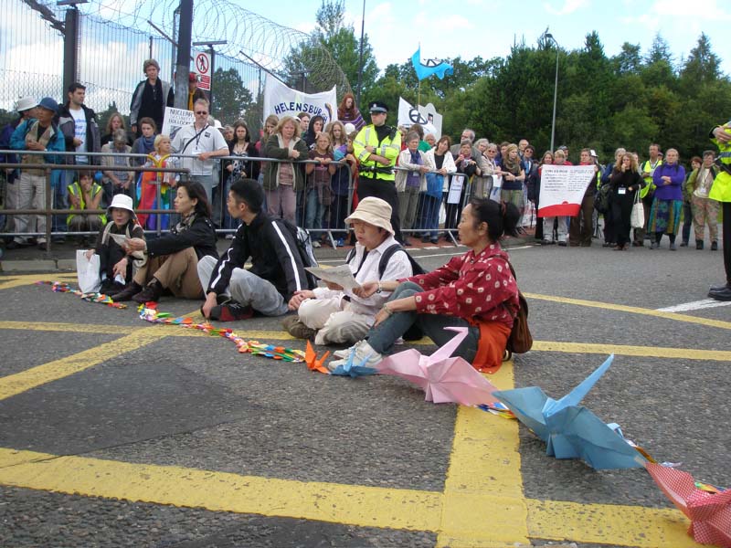 イギリスから核を廃絶するための世界市民の共同行動が,昨年10月から1年間,スコットランドの核兵器基地で取り組まれました.これに参 加するため,長崎の被爆者を含む日本の市民12名が現地に赴き,7月25日に平和的な基地封鎖を実施しました.基地前の原爆パネル展,折り鶴や竹筒を使った封鎖など,多くのドラマがありました.現地のメディアも好意的に大きく取り上げました.